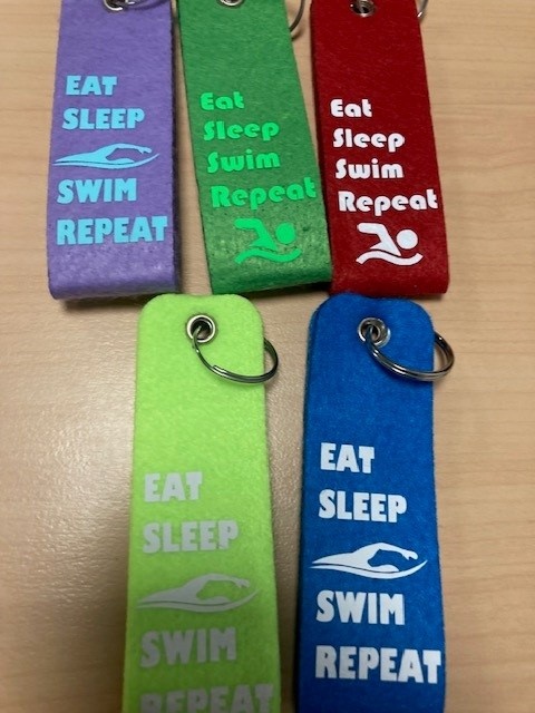 Gafe sleutelhanger met tekst Eat, Sleep, Swim, Repeat , leuk om kado te geven, herkenning zwemtas.