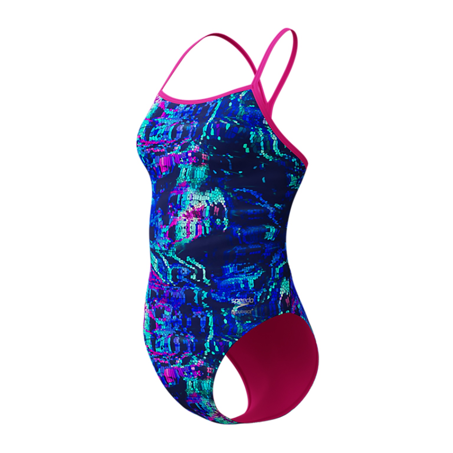 Speedo dames badpak Digitaal allover print in paars- blauw- roze kleuren met spagetti bandjes. Badpak is aan de voorkant en achterkant gevoerd en heeft een VBack rug ECO+ materiaal